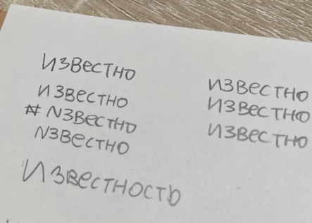 И←これとか「イー」って読むんだけど、例えばこの上の紙は「известно(イズヴィエスナ、なぜかTは発音しない)」で、よく見るとNで練習してるwww